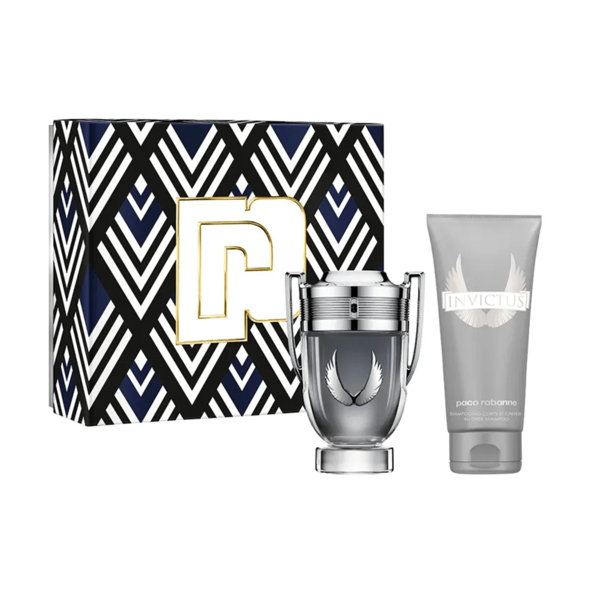 Conjunto masculino com perfume Invictus Platinum masculino amadeirado aromático e gel de banho Paco Rabanne. Para quem sempre enfrenta os desafios.