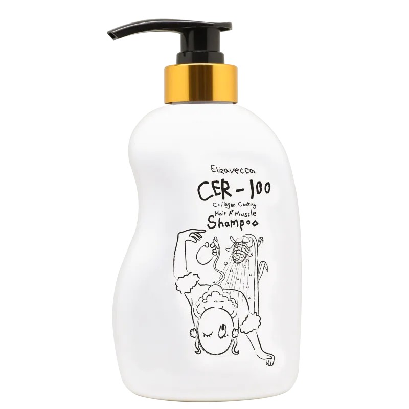 Shampoo para cabelos porosos e danificados. Elizavecca CER-100 Com Colágeno A+ Muscle limpa e revitaliza os fios, deixando-os macios e leves.